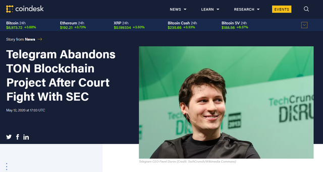 기사 내용에 따르면 텔레그램의 창립자이자 CEO인 Pavel Durov는 미국 증권 거래위원회(SEC)와의 지속적인 법정 공방 끝에 Telegram Open Network(TON)의 프로젝트를 중단 소식을 발표한다고 전했다고 합니다.