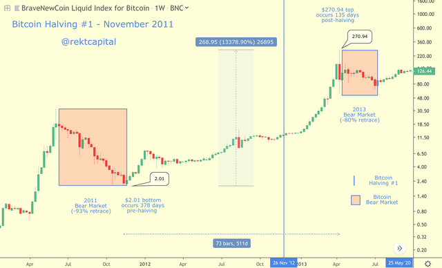 첫 번째 반감기에서 반감기 도래 전인 전반기(pre-halving)에 첫 번째 반등이 있었으며 비트코인의 가격은 663% 상승하여 반감기 전에 15.51불에 도달했습니다.