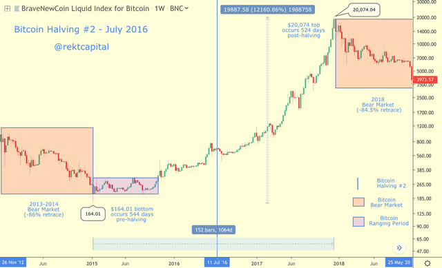 두 번째 반감기 전에 164.01불에서 저점을 찍었던 비트코인의 가격은 1068일에 걸쳐 가격상승 랠리를 시작했고 12,000%의 가격 상승을 보이며 20,074불이라는 사상 최대가격을 갱신하였습니다.