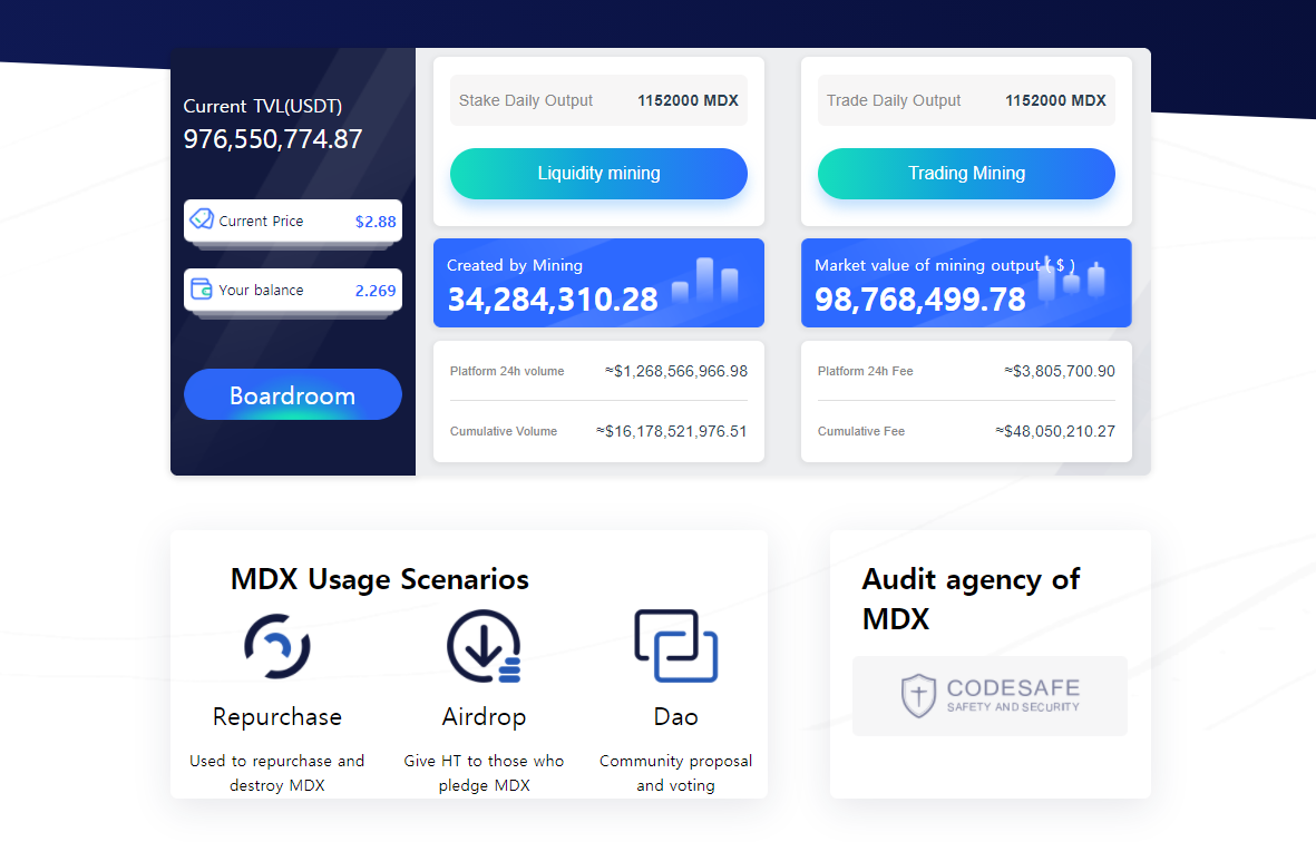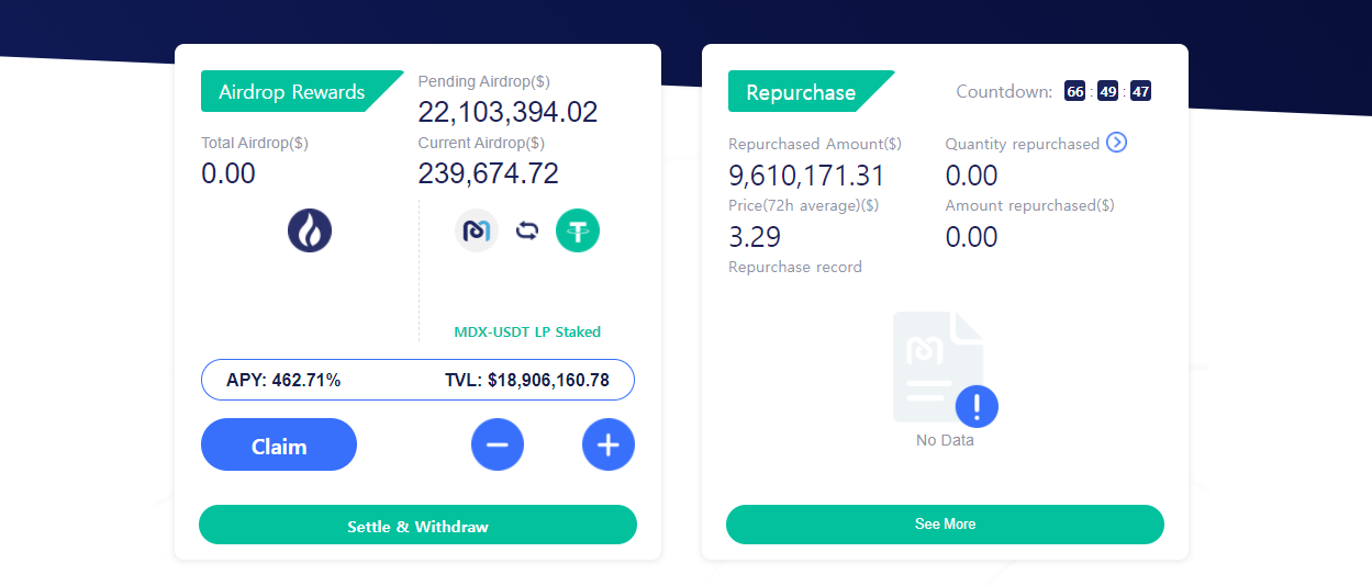 MDEX에서는 플랫폼 출시 당시에 백서를 통해 MDX의 가치 안정화를 위한 바이백과 에어드랍, DAO시스템과 관련된 토크노믹스를 공개한 바 있으며, 2월 3일부터 보드룸을 오픈하고 MDEX 플랫폼 수입의 66%에 해당하는 3,000만 달러를 에어드랍 및 바이백 풀에 사용하게 됩니다.