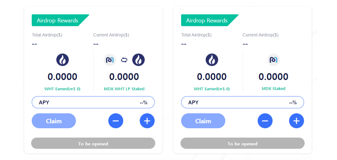 - MDX/USDT 유동성 공급자의 경우 Liquidity Mining풀에 LP스테이킹을 통해 MDX를 채굴하거나, 보드룸에서 LP스테이킹을 통해 WHT 에어드랍을 받는 것 중에서 선택이 가능합니다.