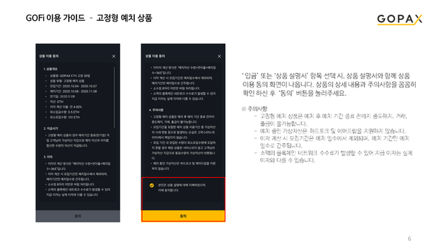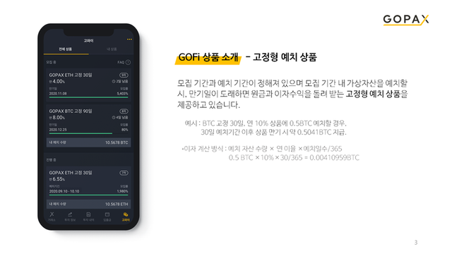 고팍스 거래소에서 비트코인(BTC)이나 이더리움(ETH)을 보유하고 있는 사용자가 단기적으로 비트나 이더를 매도할 계획이 없는 경우 은행의 정기예금처럼 거래소 지갑에 보유 중인 비트코인 또는 이더리움을 2주 동안 예치하고 예치 기간동안의 이자 수익을 얻을 수 있는 서비스입니다. (현재는 비트코인(BTC)과 이더리움(ETH)만 참여가 가능합니다)