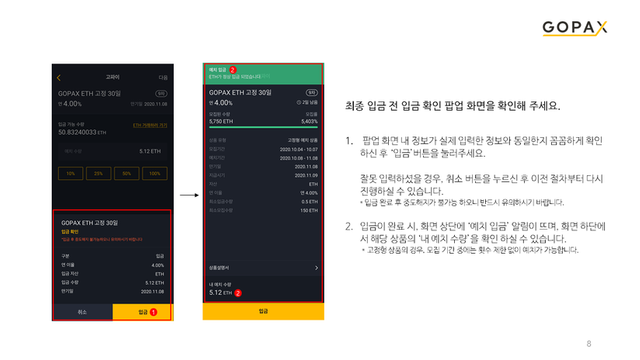 ⑥ 팝업 창에서 다시 한 번 내용 확인 후 [입금] 탭 터치, 여기까지 하시면 고파이 참여가 완료됩니다.