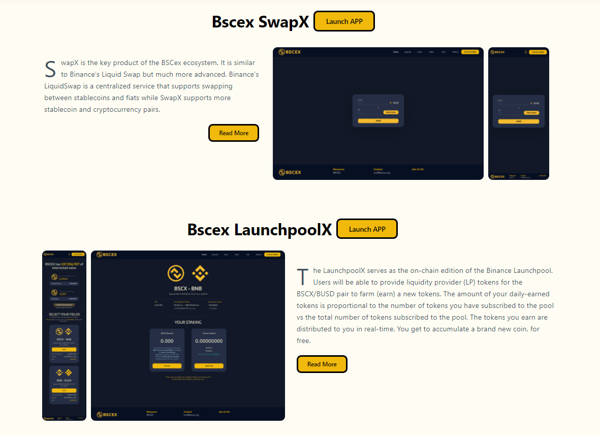 런치풀은 바이낸스 거래소의 런치풀과 유사하게 유망한 바이낸스 스마트 체인(BSC) 기반의 프로젝트들의 토큰 파밍을 온체인 상에서 가능하게 하려는 플랫폼입니다. BSCEX의 네이티브 토큰인 BSCX를 비롯하여 BNB, BUSD, CAKE 등의 유동성을 공급하여 런치풀엑스를 통해 시작되는 토큰을 파밍할 수 있습니다.
