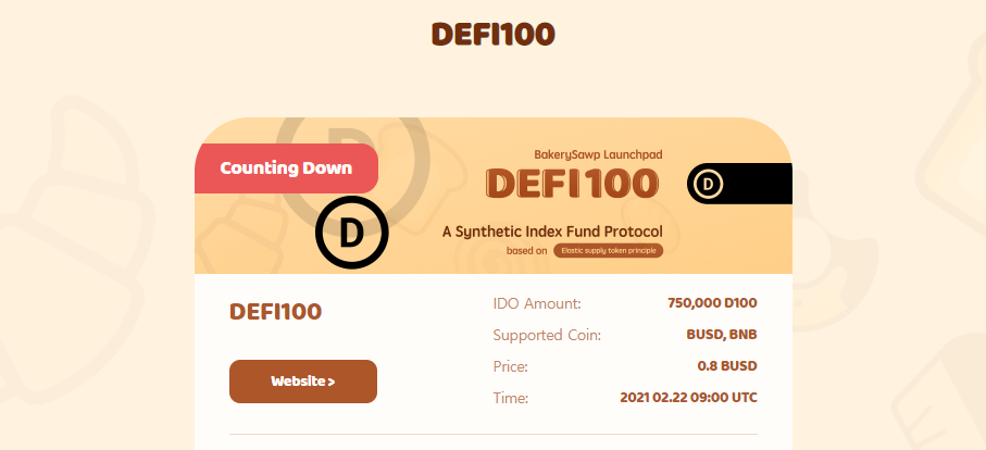 안녕하세요, 디온입니다. 우리나라 시간 기준으로 금일(2월 22일) 18시부터 베이커리스왑에서 DEFI100 이라는 합성 인덱스 펀트 프로토콜의 IDO가 진행될 예정입니다. 이전 포스팅에서 짤막하게 다룬 바 있는 것처럼 베이커리스왑은 팬케이크스왑, 버거스왑과 함께 초창기에 출시된 AMM DEX 프로토콜 중 하나로, 팬케이크스왑만큼의 인지도는 없으나 꾸준히 성장을 해오고 있습니다.