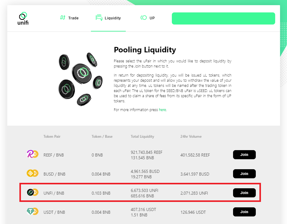 아래에서는 유니파이 프로토콜에서 UNFI/BNB풀에 유동성을 공급하는 방법에 대해서 설명합니다.