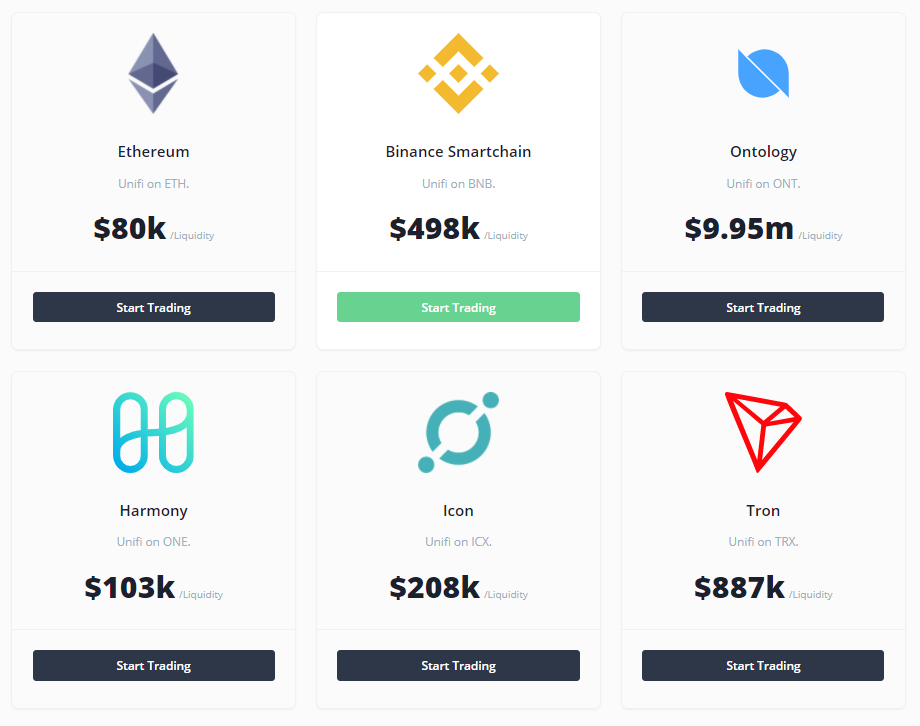 현재 Unifi Protocol은 이더리움, 바이낸스 스마트 체인, 온톨로지, 하모니, 아이콘, 트론까지 멀티 퍼블릭 체인 네트워크에서 디파이 스마트 컨트랙트를 지원하고 있으며, 현존하는 대다수의 디파이 프로토콜들이 유니스왑 클론(Uniswap의 코드를 복제하여 약간 수정한 형태로 가져다 쓰는 것)인 것과는 달리 각각의 체인에 맞춤형 스마트 컨트랙트를 제공하고 있습니다.