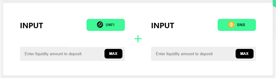 ② 유동성을 공급하고자 하는 UNFI 또는 BNB 수량을 입력합니다. 유동성 공급은 50:50이 원칙이므로 동일한 가치에 상응하는 UNFI토큰과 BNB를 지갑에 보유하고 있어야 합니다.