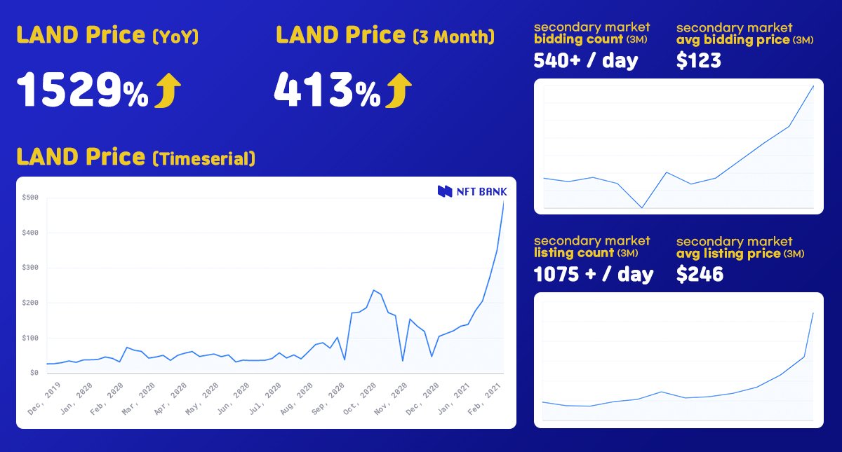 NFT Bank에서 집계한 자료를 살펴보면 3개월 기준으로 LAND의 가격이 400% 상승했고 초창기 바이낸스 런치 패드 발표 전의 기준으로는 1,500%가 상승한 것을 확인할 수 있습니다. 디파이의 다음 트렌드라고 많이들 예측하고 있는 NFT의 선두에 있는 대표 프로젝트 중 하나로 평가 받는 더 샌드박스에 대한 기대감과 인기가 반영된 수치가 아닌가 싶네요.