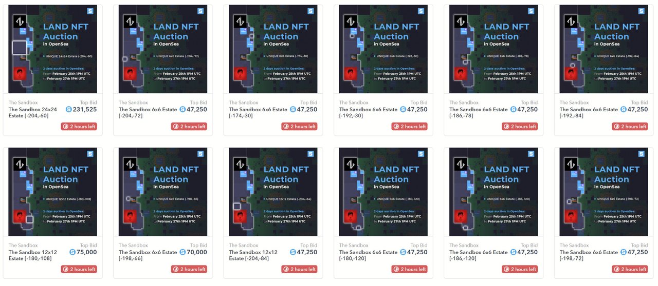 안녕하세요, 디온입니다. 지난 2월 25일부터 시작된 더 샌드박스의 퍼블릭 세일 2라운드 역시 순삭이 되면서 더 샌드박스와 LAND의 엄청난 인기를 실감할 수 있었습니다. 여기에 더불어 2월 25일부터 시작된 오픈씨에서의 ESTATE 옥션 마감까지 이제 약 1시간 정도가 남았습니다.