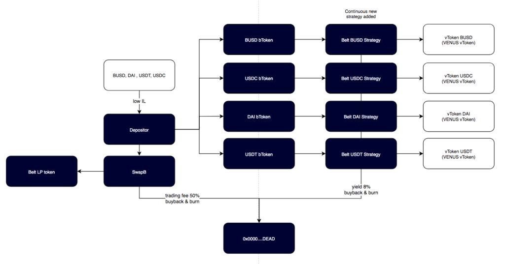 벨트 파이낸스(Belt.fi)는 바이낸스 스마트 체인(BSC)의 사용자들의 보유한 자산 포지션의 안정서을 유지하면서 최소한의 리스크로 최대의 수익을 얻을 수 있도록 돕는 AMM(Automated Market Maker) 프로토콜로, 프로젝트 팀의 소개에 따르면 비영구적 손실(IL)이 거의 없다는 특징을 가지고 있다고 합니다. 프로토콜은 다음의 3가지 전략을 조합하여 이 목표를 달성합니다.