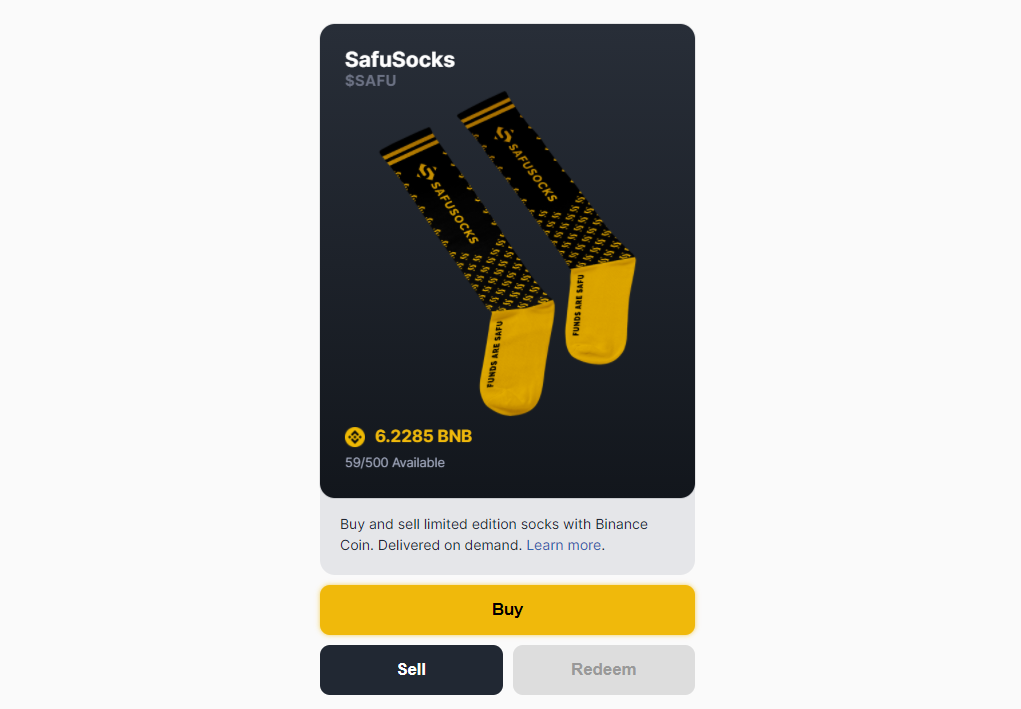현재 SafuSocks의 한 켤레당 가격은 6.2285 BNB로 약 1,500달러 수준의 가격에서 거래가 되고 있으며, 450개 중에서 59개가 남아 있는 상황입니다. 위의 본딩 커브를 보시면 아시겠지만, 여기서 새로운 구매자가 나타나는 경우에는 또 가격이 급격히 상승하게 되어 있습니다.