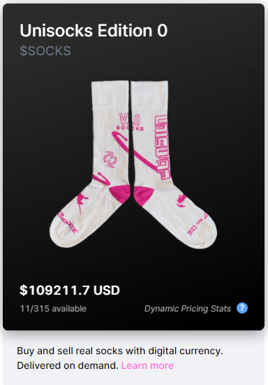 사실 이 유니삭스가 이 가격에 거래되고 있는 이유는 유니스왑의 UNI토큰 출시 당시에 SOCKS토큰 홀더들을 대상으로 에어드랍이 있었던 것과 한정판으로 발행되어 315개만 존재한다는 이유 때문이었습니다. 여기에 유니삭스는 세상에서 가장 비싼 양말로 이름을 올리면서 마케팅 효과까지 가미가 되었습니다.