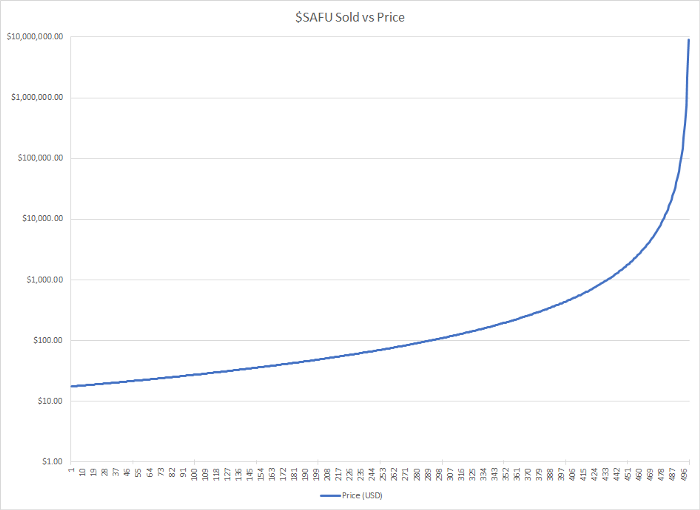 SAFU는 총 500개가 발행되어 그 중 450개가 판매가 되며, 50개는 프로모션 용도로 사용이 됩니다. 450개의 SAFU는 0.1BNB로 시작이 되어 구매가 발생할 때마다 급격히 가격이 상승하는 본딩 커브 방식으로 가격이 결정되며, 언제든지 SAFU 구매자들은 현재 시장 가격으로 재판매도 가능합니다.