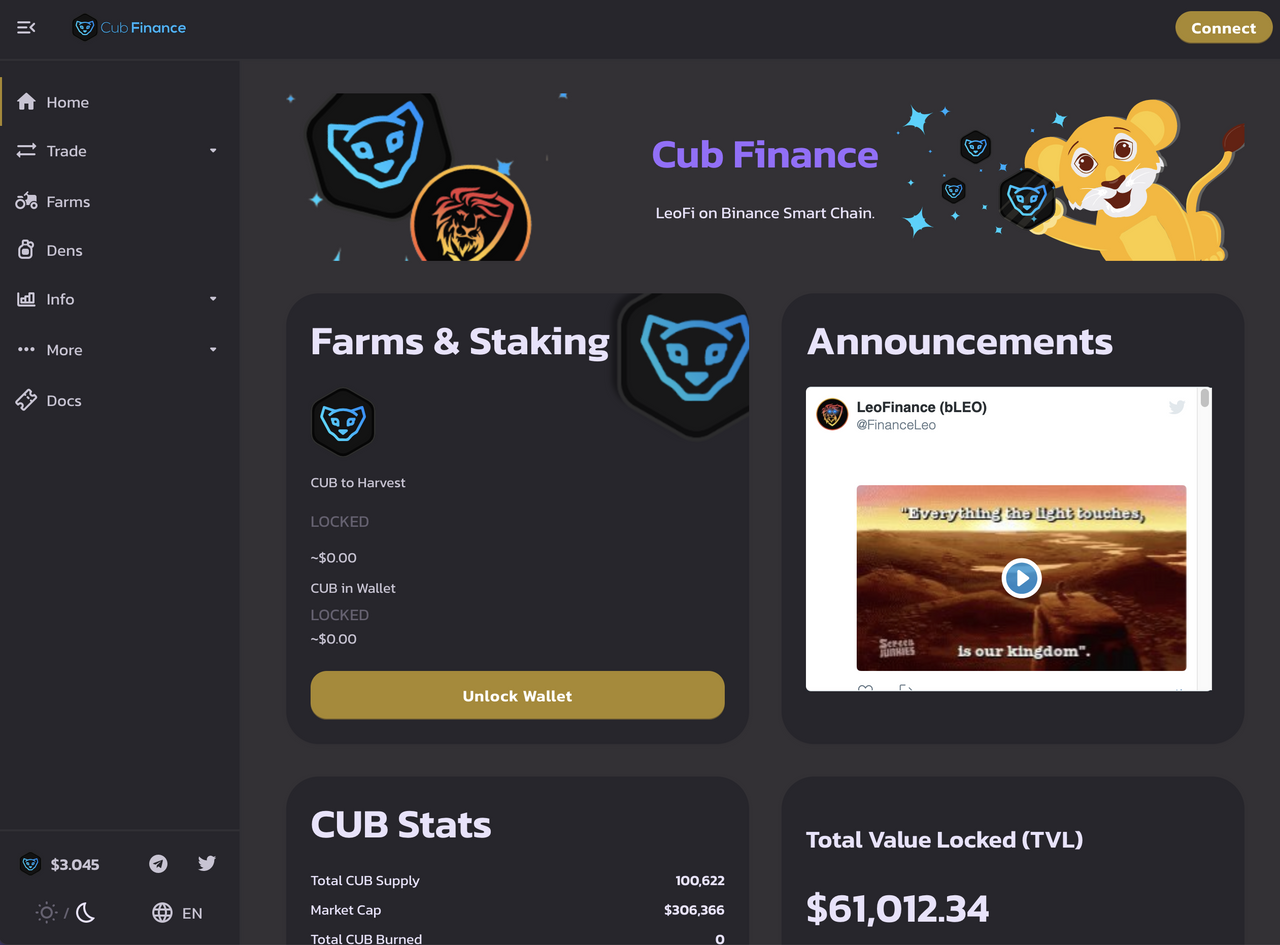 안녕하세요, 디온입니다. 스팀 블록체인의 포크 전에 스팀엔진에서 SteemLeo로 활동하던 Leo Finance에서 이더리움의 유니스왑에 이어 바이낸스 스마트 체인의 디파이 생태계로도 그 영역을 확장하였습니다. 구스 파이낸스의 포크 버전으로 보이는 Cub Finance가 오늘 출시되었고 기존 하이브엔진 기반의 LEO도 사용할 수 있도록 랩핑 연결을 시켜놓았네요.
