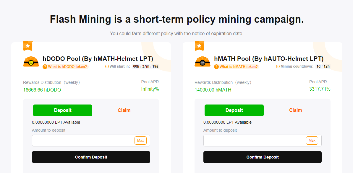 플래시 마이닝풀에 hMATH/HELMET 유동성을 공급하고 해당 LP토큰을 스테이킹하여 hDODO토큰을 채굴할 수 있습니다.