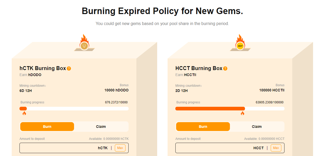 버닝 박스(Burning Box)에 만료된 정책 토큰인 hCTK를 스테이킹하고 내 토큰 수량의 점유율 + 스테이킹 기간에 따라 hDODO토큰을 마이닝할 수 있습니다. hCTK토큰은 hDODO토큰을 마이닝하는 대신 소각이 됩니다.