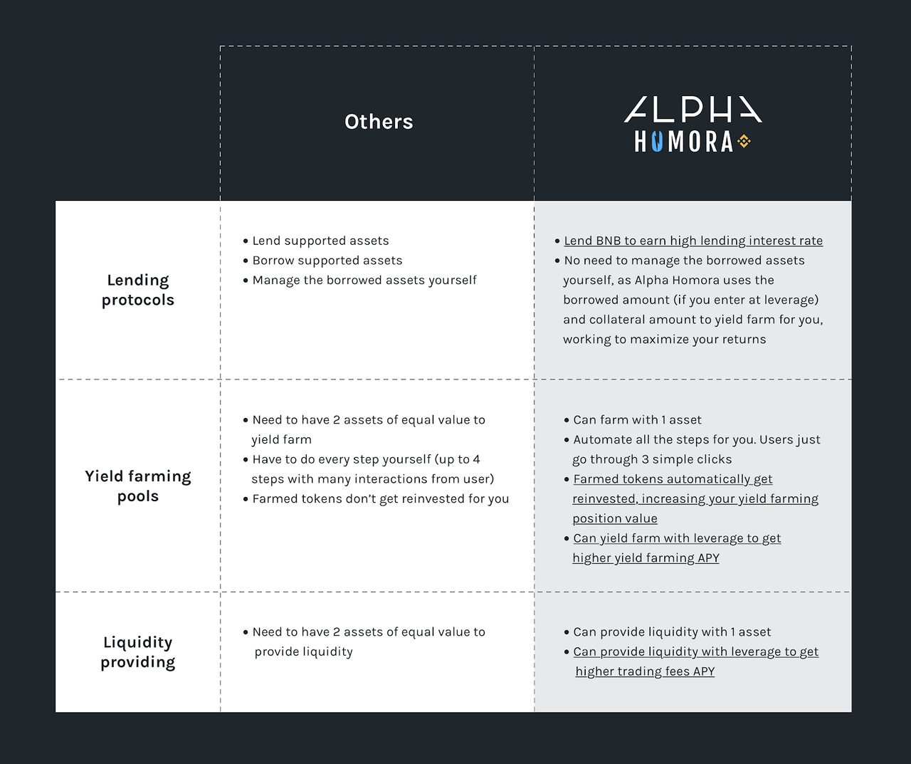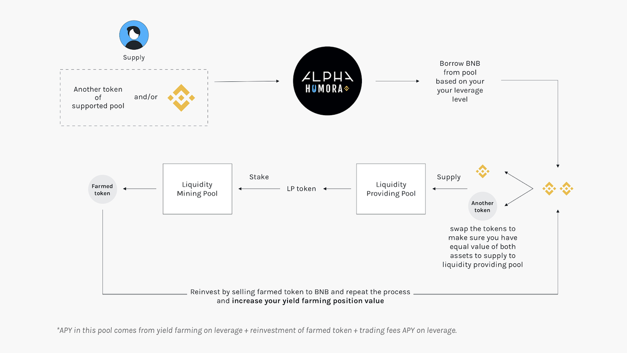 안녕하세요 디온입니다. 오늘 바이낸스 스마트체인에 일드 옵티마이저의 끝판왕이라고 할 수 있는 Alpha Homora가 런칭되었습니다. 알파는 디파이 생태계 최초의 레버리지 일드 파밍 및 레버리지 유동성 공급 프로덕트로서 사용자들은 조금 더 높은 리스크를 부담하는 대신 보다 높은 파밍 수익률을 얻을 수 있습니다.