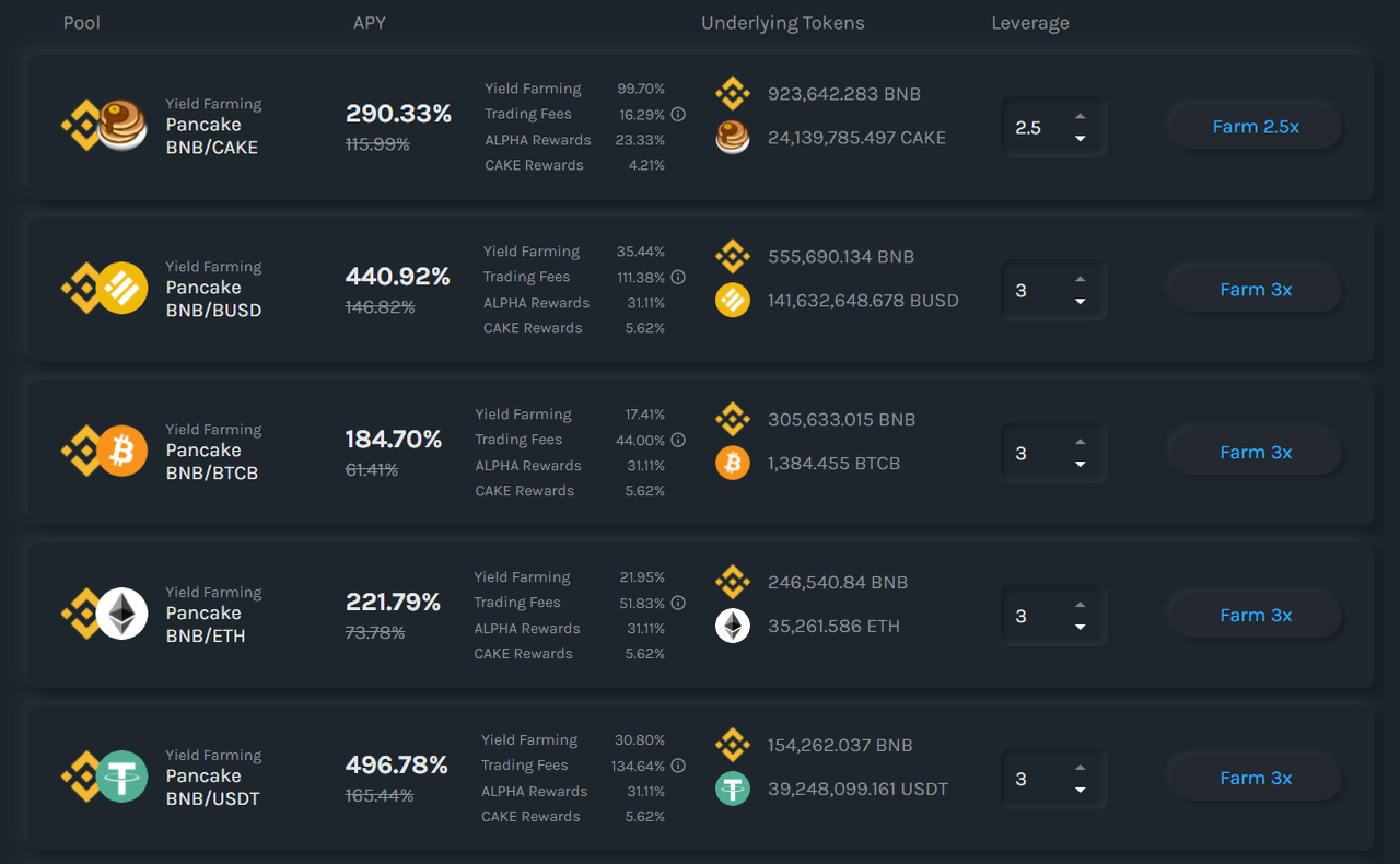 반면에 유동성을 공급하고 비영구적 손실(IL) 및 청산(liquidation) 리스크를 감수하고라도 최대의 수익률을 얻고자 하는 파머들(유동성 공급자)들은 알파의 파밍 풀(https://homora-bsc.alphafinance.io/farm)에서 유동성을 공급하고 원하는 수준의 리스크를 설정하여 레버리지를 조절할 수 있습니다.