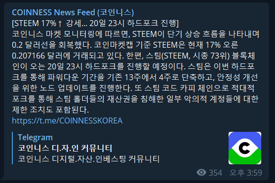 내일 23시에 진행 예정인 스팀 하드포크와 관련된 소식은 국내 크립토 미디어 위주로 계속해서 전달이 될 수 있도록 노력 중입니다. 현재 조인디 인터뷰 기사와 코인니스 뉴스 피드로 송출이 완료되었으며, 보다 자세한 내용은 조인디의 인터뷰 기사를 통해 확인하실 수 있습니다.