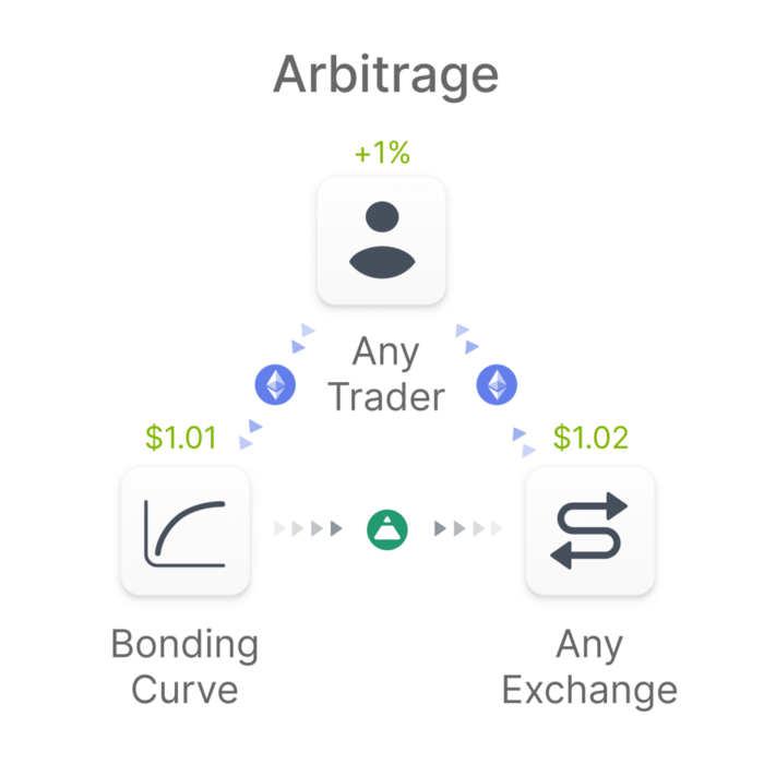 추가적인 인센티브의 지급은 현재의 FEI가격이 페깅된 기준 가격보다 낮은 경우에만 적용이 됩니다. 페깅된 기준 가격 이상인 경우에는 아래에서 볼 수 있는 것처럼 본딩 커브와 함께 차익거래 루프를 통해 관리가 됩니다.
