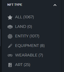 NFT애셋은 Entity, Equipment, Wearable, Art까지 크게 4가지 카테고리로 구분이 됩니다. 각 타입별 자세한 설명은 여기서는 생략하고 추후 별도의 포스팅을 통해 자세히 다뤄보도록 하겠습니다.