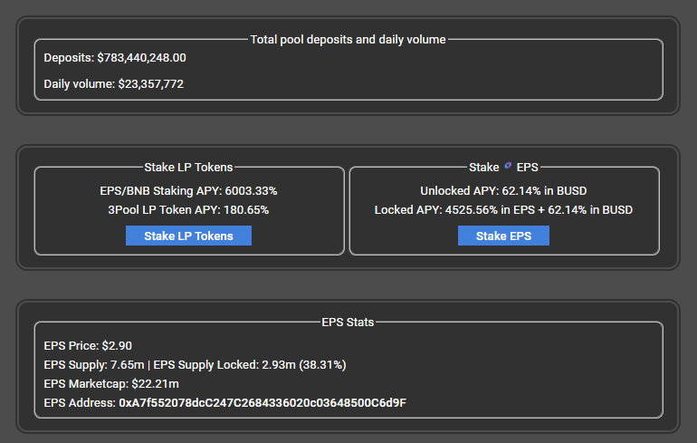 일단 기본적으로 3개월 베스팅 조건으로 EPS토큰이 지급된다는 점, 그리고 3개월 락업을 하고 있는 사용자들이 중도에 이탈한 사용자들로부터 걷은 패널티 비용을 배분받는다는 점, 바이낸스 스마트 체인의 저렴한 수수료 비용으로 인해 사용빈도가 높다는 점, 마지막으로 어크립토스나 벨트 파이낸스 등 기존 시장에서의 유동성을 한방에 모두 끌어왔다는 점 등으로 인해 오히려 커브 파이낸스보다 더 크게 성장할 가능성이 높다고 보고 있습니다.