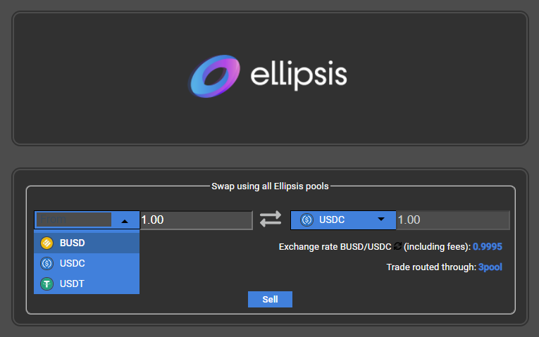 Ellipsis Finance는 바이낸스 스마트 체인에서 서로 다른 종류의 스테이블코인들을 교환할 수 있는 거래소입니다. 매우 낮은 슬리피지와 낮은 수수료로 스테이블코인간 변환이 가능하다는 것이 특징입니다. 예를 들어 BUSD가 필요한 테더 홀더들은 그 볼륨의 크기에 관계없이 큰 손해를 보지 않고 USDT를 BUSD로 변환할 수 있습니다.
