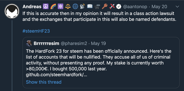 저는 그동안 그의 탈중앙화 관련 책, 팟캐스트 등의 콘텐츠에 매우 감탄한 바 있었던 만큼 이번에 그의 트윗에 블록체인 하드포크, 컨센서스, 탈중앙화된 이슈를 해결함에 있어 "집단 소송"을 언급한 것이 굉장히 충격적이었습니다. 이는 그동안 그가 그렇게 열심히 설교해왔던 내용에 완전히 반대되는 것이기 때문입니다.