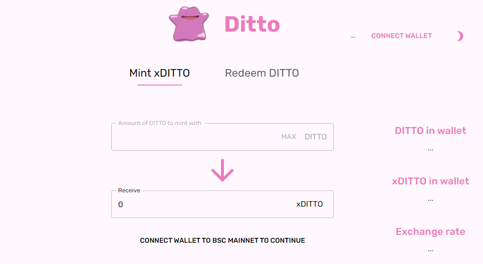 반면, xDITTO는 리베이스 메커니즘이 없는 BEP20 토큰으로 언제든지 DITTO와 다양한 교환 비율로 스왑이 가능한 토큰입니다. xDITTO의 출시 목적은 DITTO가치의 희석 없이 DITTO의 마켓캡을 성장시키는 것입니다. DITTO를 락업하고 받은 xDITTO는 xDITTO/BNB LP토큰을 스테이킹하여 파밍을 하거나, 언제든지 다시 DITTO로 변경할 수 있습니다.