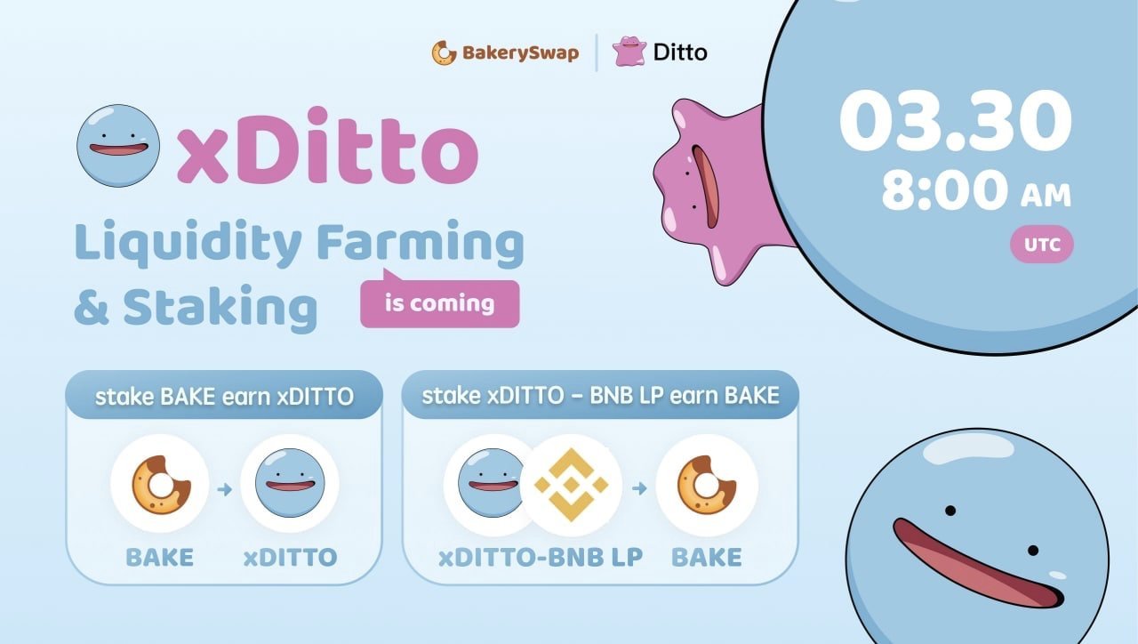 오늘(3월 30일) 우리나라 시간 기준으로 오후 5시 부터 xDITTO/BNB 유동성을 공급하고 LP토큰을 스테이킹하여 베이커리스왑에서 BAKE토큰을 파밍할 수 있습니다. 이와 동시에 BAKE토큰 홀더들은 BAKE토큰을 스테이킹하여 xDITTO를 파밍하는 것도 가능합니다.