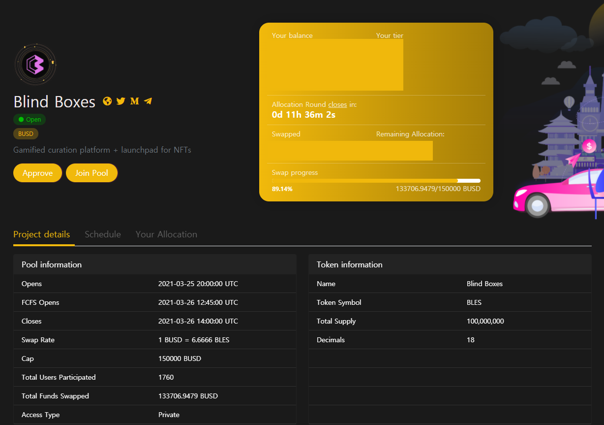 결국 이러한 토큰런처 모델의 성공 여부는 ①해당 런치패드 토큰의 가격과 해당 런치패드에서 ②토큰세일을 통해 판매한 토큰의 흥행여부에 따라 판가름이 나는데, 며칠 전 BSCPAD에서 2차 토큰세일로 진행한 BlindBoxes의 BLES토큰의 경우에는 1개당 0.15달러에 판매했던 BLES가 토큰세일 후 약 12달러까지 상승하면서 제법 흥행에 성공하는 모습을 보여줬습니다. (현재는 약 6달러 수준에서 거래가 되고 있습니다)