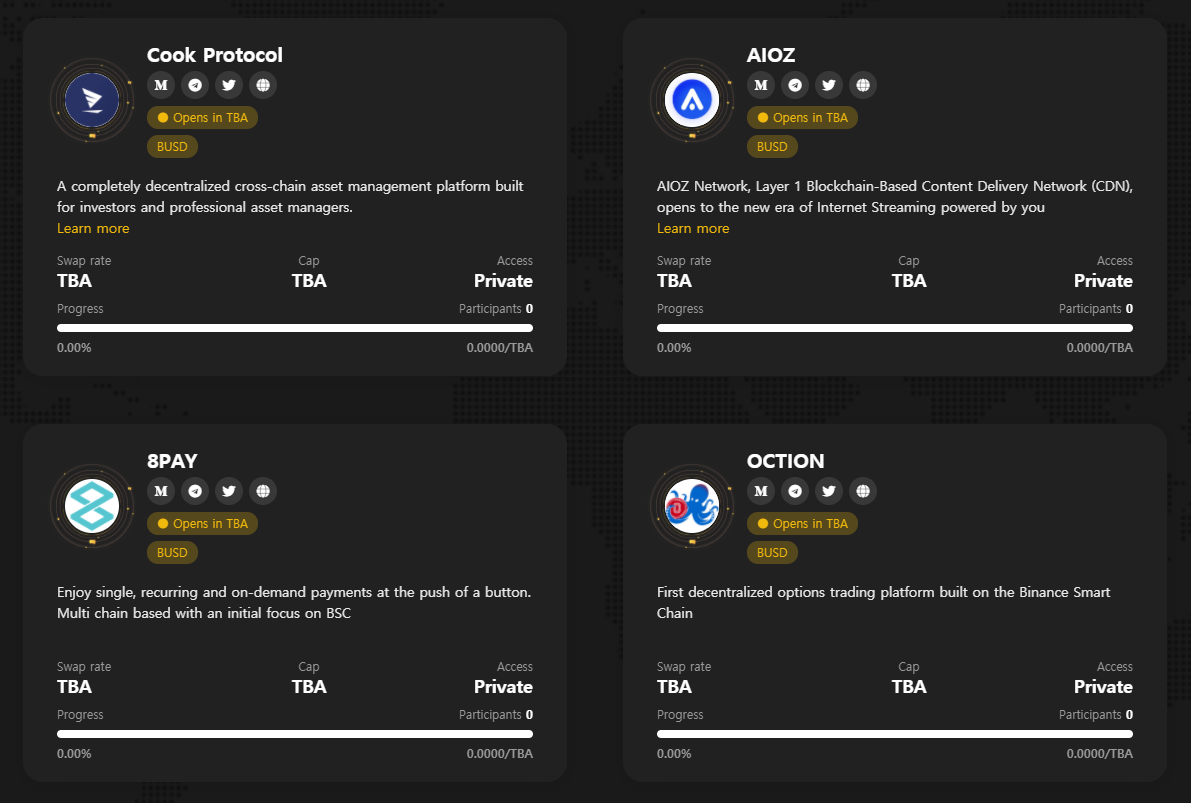 그리고 바이낸스 스마트 체인(BSC)에서도 이 유리한 고지를 선점하고자 하는 유사한 테마의 프로젝트들이 계속해서 출시가 되고 있는 추세입니다. 가장 유명한 팬케이크스왑의 IFO를 비롯해 지금은 LaunchZone으로 리브랜딩한 BSCX, 그리고 지금 소개드리고 있는 BSCPAD를 비롯하여 여러 유사 프로젝트들이 등장하고 있습니다.