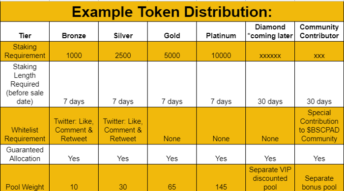 현재 BSCPAD의 경우에는 5,000개 이상의 Gold티어 정도가 되어야만 화이트리스트 등록을 위한 소셜 활동을 할 필요없이 편하게 토큰세일에 참여할 수 있으며 25,000개 이상의 티어인 다이아몬드 등급의 경우에는 여러가지 추가 혜택을 지원할 예정이라고 합니다.