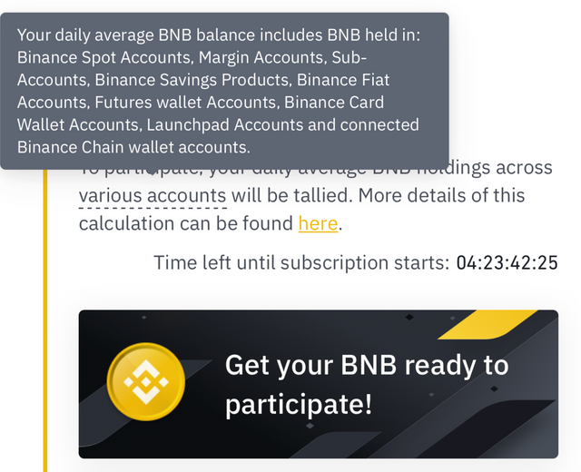 바이낸스 런치패드 참여를 위한 평균 BNB 잔액 계산 시에 바이낸스 계정에 연결된 바이낸스 체인 월렛 계정의 잔액도 포함이 됩니다. 자세한 내용은 아래 팝업 메시지 참조 (바이낸스 정말 대단하네요..)