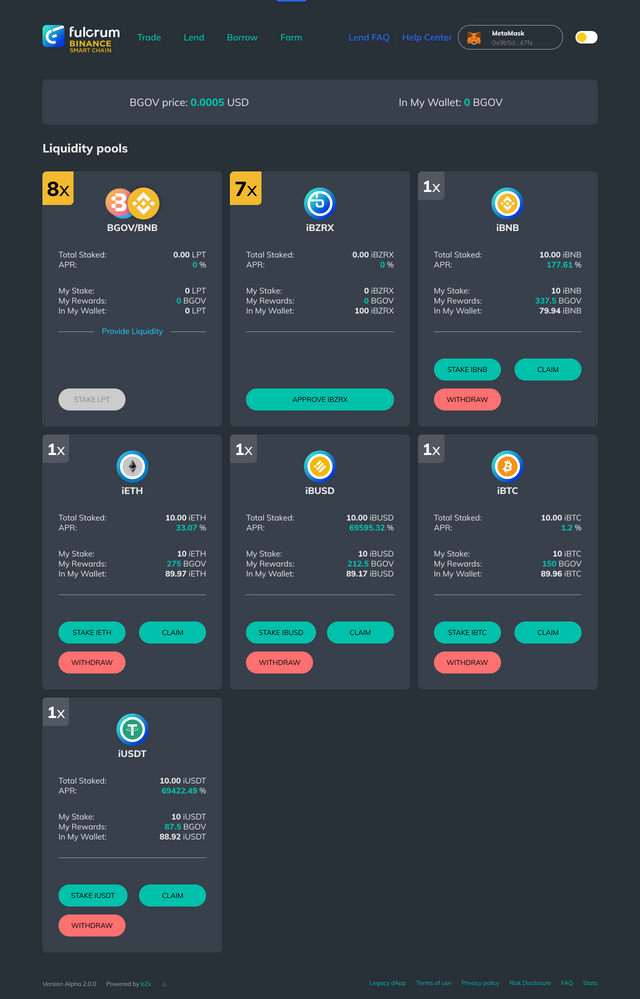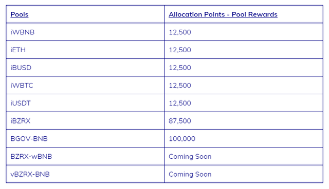 여기에 LP토큰 또는 싱글토큰을 스테이킹하여 BGOV라는 토큰을 채굴할 수 있으며, 향후에는 bZx network의 네이티브 토큰인 BZRX의 유동성 풀이 2개 추가될 예정입니다.