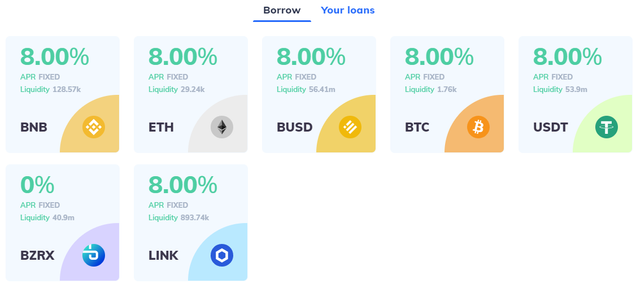 Fulcrum에서의 대출은 변동 이자율로 현재 그 이율이 매우 낮은 수준이며, 반대로 차입의 경우에는 8% 고정 이율인 관계로 다른 렌딩 플랫폼들과 비교했을 때 나쁘지 않은 수준이라고 할 수 있습니다.
