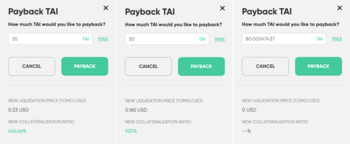 차입한 TAI는 언제든지 PAYBACK을 통해 상환할 수 있으며, 상환 시에는 TAI 차입기간에 비례한 이자가 추가로 포함됩니다. 그러나 보다 많은 사용자들이 Tomo Finance를 이용하도록 차입 이자의 50%는 Tomo Finance의 거버넌스 토큰인 TFI로 사용자에게 페이백됩니다.