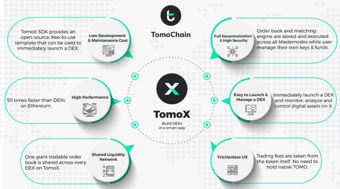 탈중앙화된 블록체인 금융 인프라를 구성하는 것을 목표로 하는 토모체인은 누구나 25,000 TOMO를 지급하면 간편하게 DEX를 구축할 수 있는 턴키 방식의 DEX플랫폼 TomoX를 출시하였으며, 이더리움 생태계 DeFi들의 대부분의 기능을 모두 지원하는 동시에 ERC-20 및 ETH의 페어도 지원합니다.