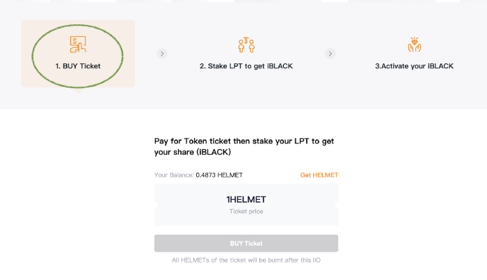 - HELMET/BNB LP토큰을 이미 헬멧 인슈어 마이닝 페이지에 스테이킹하고 있는 경우에는 IIO 티켓 비용인 1 HELMET만 지불하면 됩니다