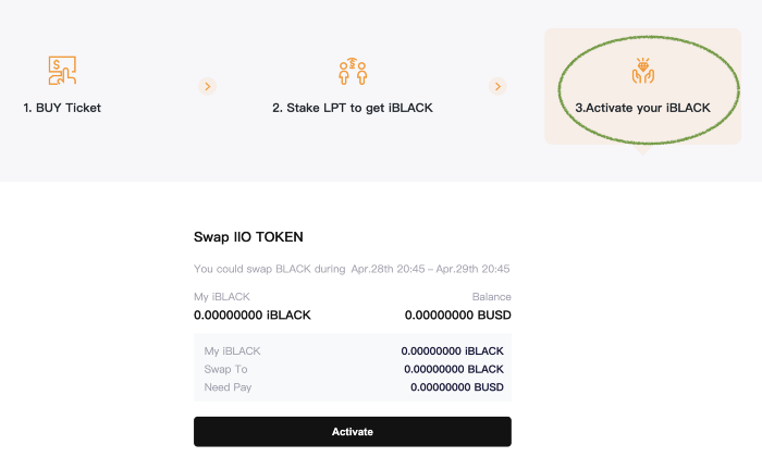 만약에 iBLACK 토큰을 100개 채굴한 경우에는 액티베이션 기간 동안 iBLACK 토큰 100개를 BLACK 토큰으로 교환할 수 있으며 이 때에는 추가적으로 5 BUSD(=100 x 0.05BUSD)가 필요합니다. 더불어 액티베이션 기간 동안에 토큰 교환을 완료하지 않는 경우에는 iBLACK 토큰은 아무 쓸모가 없는 디지털자산이 될 수 있으므로 반드시 기간 내에 액티베이션(교환)을 완료하셔야 합니다.