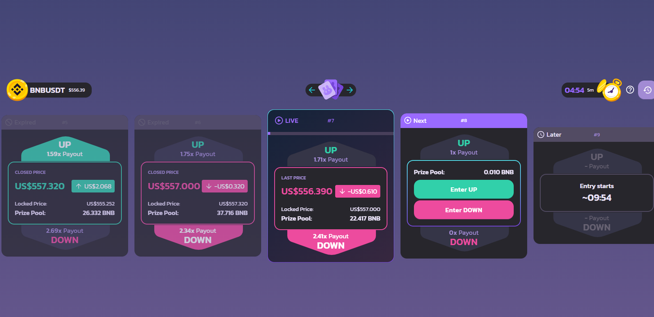 DOWN으로 예측하는 베팅액이 많을수록 UP쪽의 상금 배율이 더 높아지고, 반대로 UP으로 예측하는 베팅액이 많을수록 DOWN쪽의 상금 배율이 높아지며 BNB를 베팅한 후에는 취소가 불가능합니다.