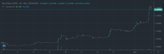 현재 HOO토큰은 바이낸스 스마트 체인과 이오스의 DFS 등에서 활발하게 거래가 되고 있는데, 후 스마트 체인의 런칭 소식과 함께 팬케이크스왑 리스팅 당시 대비 꽤나 가격이 급격히 상승한 모습입니다. 지금까지의 후닷컴 거래소가 디앱들을 개발하거나 투자해왔던 전력을 보았을 때 장기적으로는 현재 가격보다 훨씬 더 크게 상승할 가능성이 높다고 생각이 됩니다.