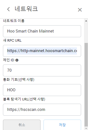 EVM 호환성을 가진 다른 체인들이 그런 것처럼 후 스마트 체인의 경우에도 메타마스크에서 네트워크 설정 변경을 통해 접속을 하실 수 있습니다.