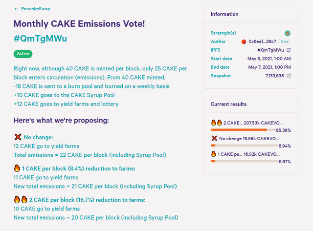 안녕하세요, 디온입니다. 블록당 CAKE의 발행량을 기존 대비 0%에서 최대 16.7%까지 감소시키는 프로포절에 대한 투표가 진행 중입니다. 투표는 48시간 동안 진행되므로 최종 결과가 바뀔 수도 있지만 현재로서는 기존 대비 16.7%를 감소시키는 옵션 투표율이 가장 높은 상황입니다.