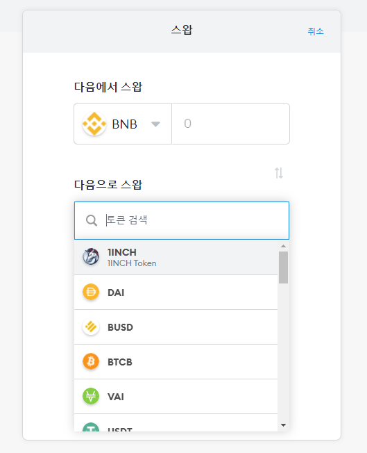 사용 방법은 매우 간단합니다. 메타마스크 로그인 후 첫 페이지에서 [스왑] 버튼을 클릭하고, 교환하고자 하는 토큰의 종류를 선택한 후에 수량만 입력하면 됩니다.