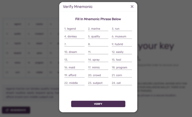 ④ 해당 문구를 잘 저장했는지 확인하는 화면입니다. 빈칸에 해당 문구를 입력한 후에 [VERIFY] 버튼을 클릭하세요