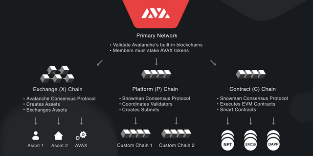 아발란체에는 3가지 종류의 빌트인 체인이 있으며 이 각기 다른 3가지의 블록체인들은 모두 프라이머리 네트워크에 의해 검증되고 보호가 되지만 기능적인 측면에서의 차이가 있습니다.
