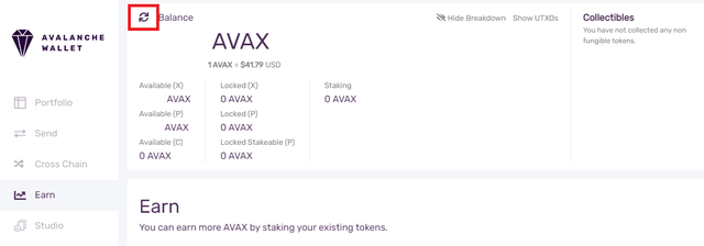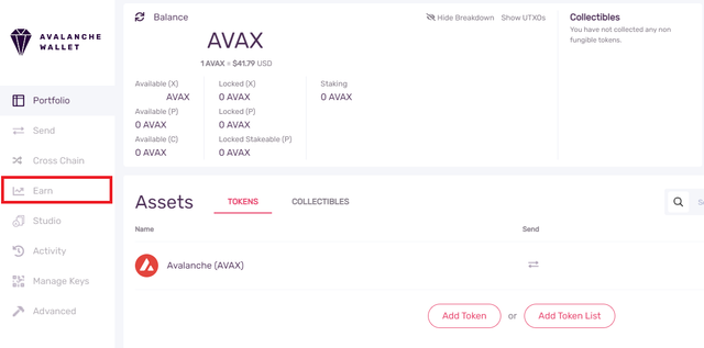 ② 월렛으로 AVAX출금이 완료되었으면, 아발란체 월렛에서 좌측에 보이는 Earn탭을 클릭합니다