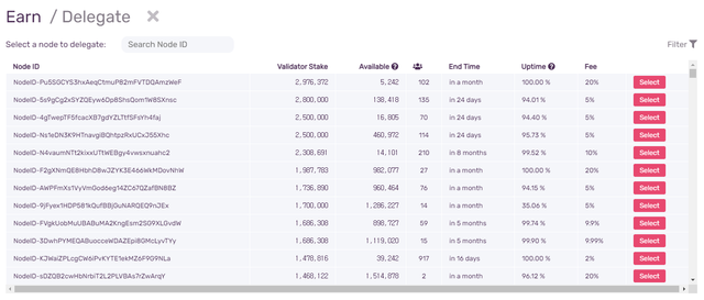 ① 이제 위임을 할 노드를 선택해야 하는데, 위와 같이 밸리데이터 노드들의 리스트가 나타납니다.